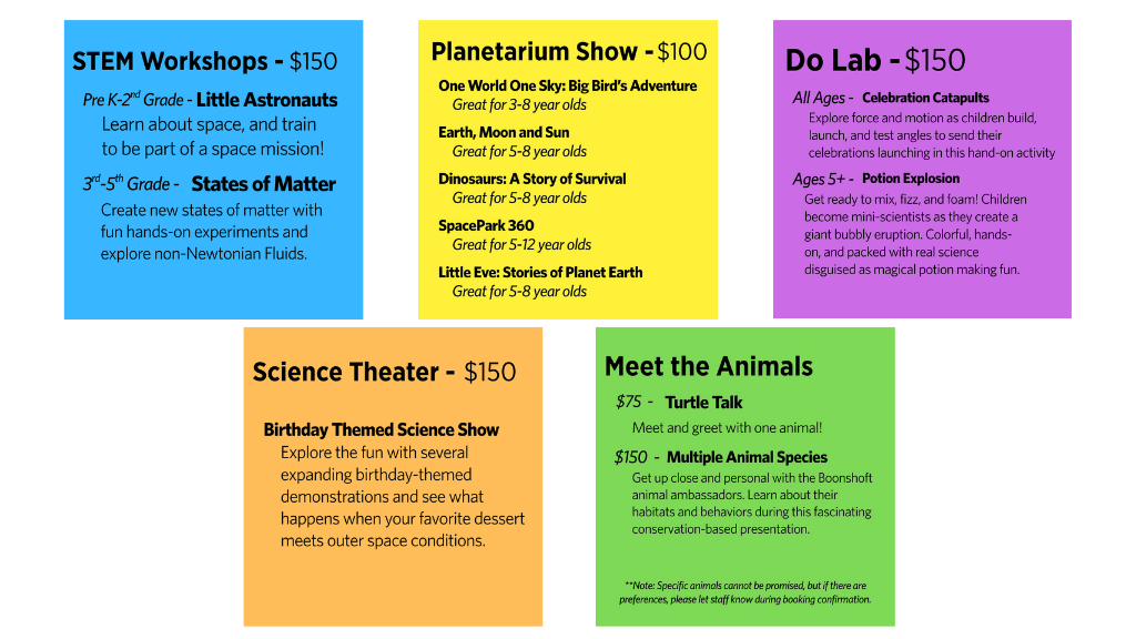 These educational experiences, led by passionate educators, will turn your celebration into a fun-filled adventure of discovery and learning.