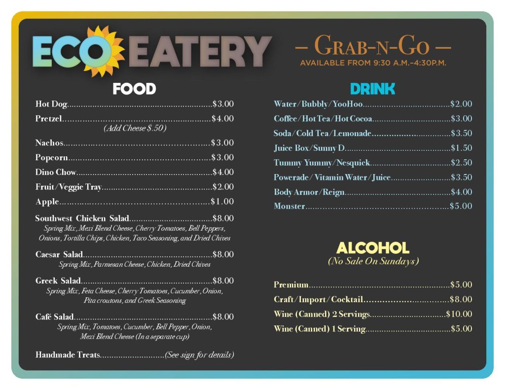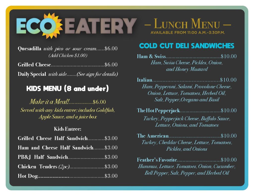 Our Eco Eatery manager, Michael “Nails” Kubilius, brings 12 years of experience in the restaurant industry, including his time at Corner Kitchen, Loose Ends, and Blind Bob’s. With his talent, we now offer not only fresh salads and sandwiches, but so much more! He loves to bake and make his menu items from scratch using the least amount of pre-made/pre-packaged products as possible. This leads to fresher foods, less waste, and delicious offerings. Some of his menu items include baked potatoes, gyros, fancy chicken sandwiches, and scratch-made muffins, cookies, and bars.