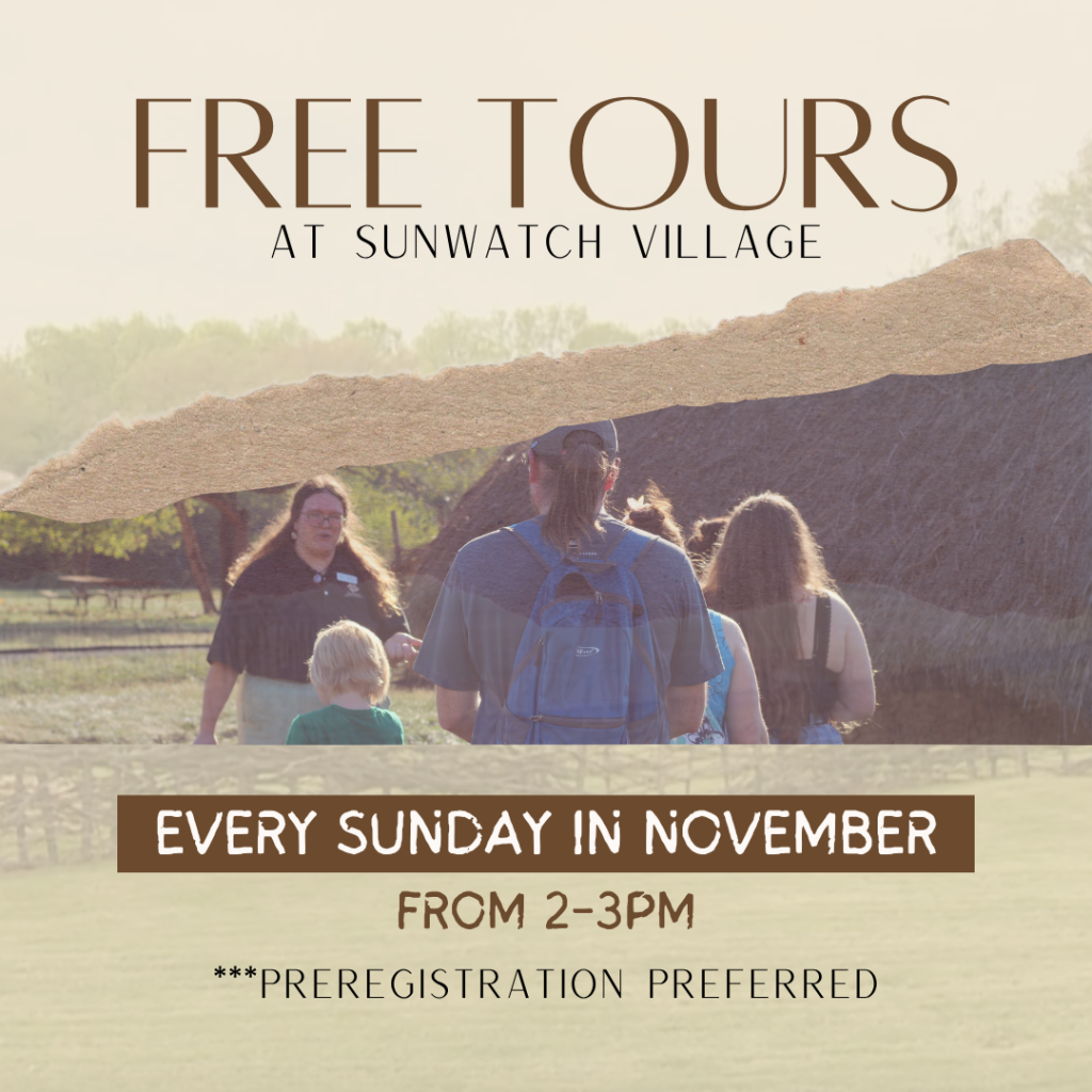 Sign up for a FREE guided tour of SunWatch Village throughout the month of November as we celebrate Indigenous Peoples’ Heritage Month! Tours are free of charge, but pre-registration is strongly encouraged.